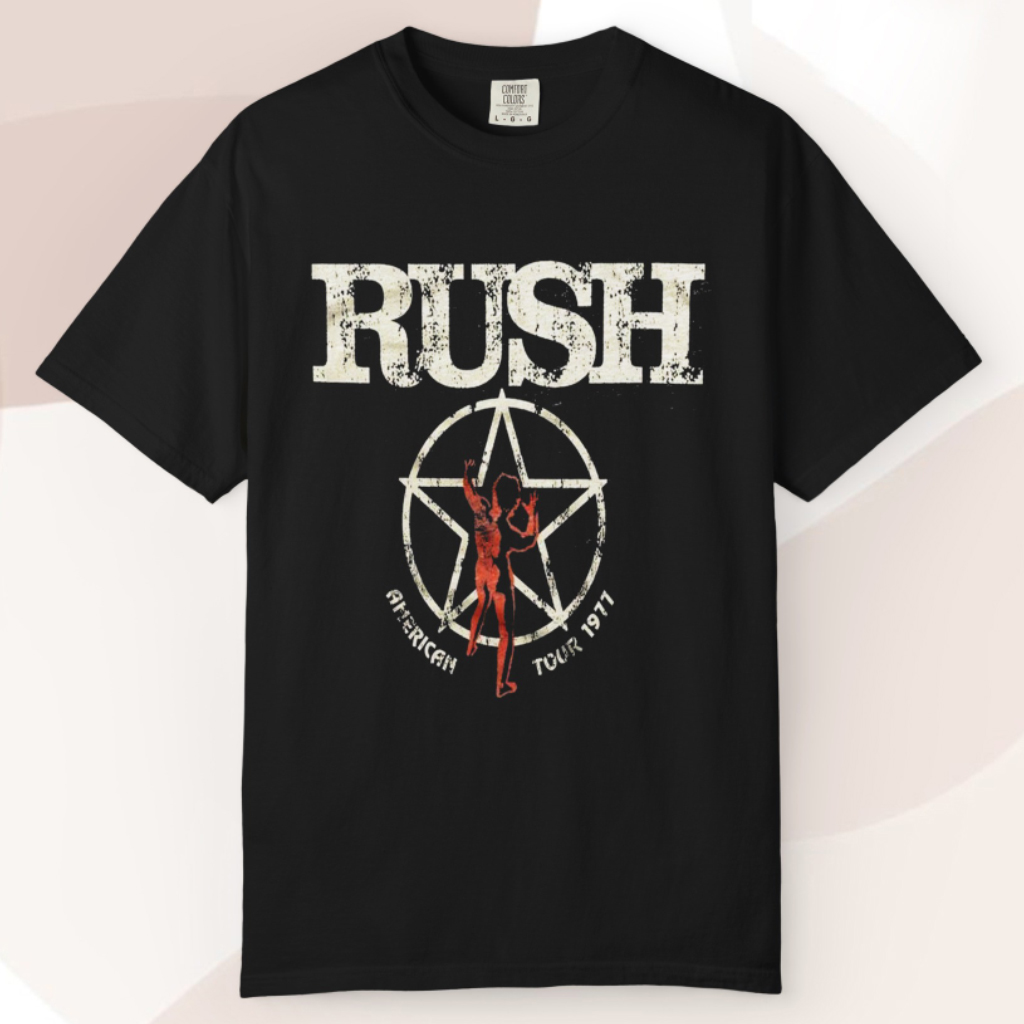 Above the artwork, the bold “Rush” lettering grabs attention with a classic font that reflects the band’s progressive rock identity. Below, “American Tour 1977” grounds the design in a specific era of Rush’s career, evoking the energy and raw intensity of their performances during that legendary tour. The placement of each element is balanced and intentional, giving the shirt a timeless concert-poster feel.