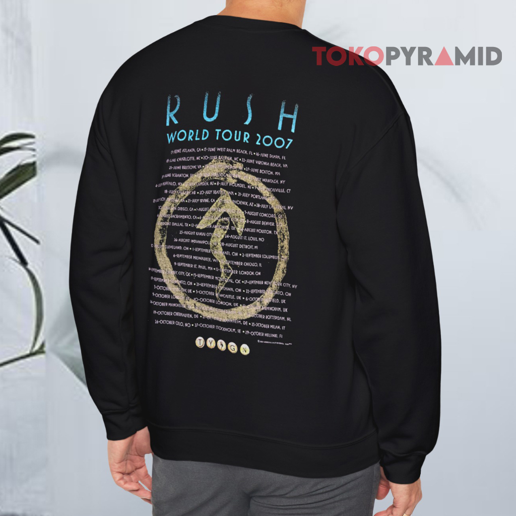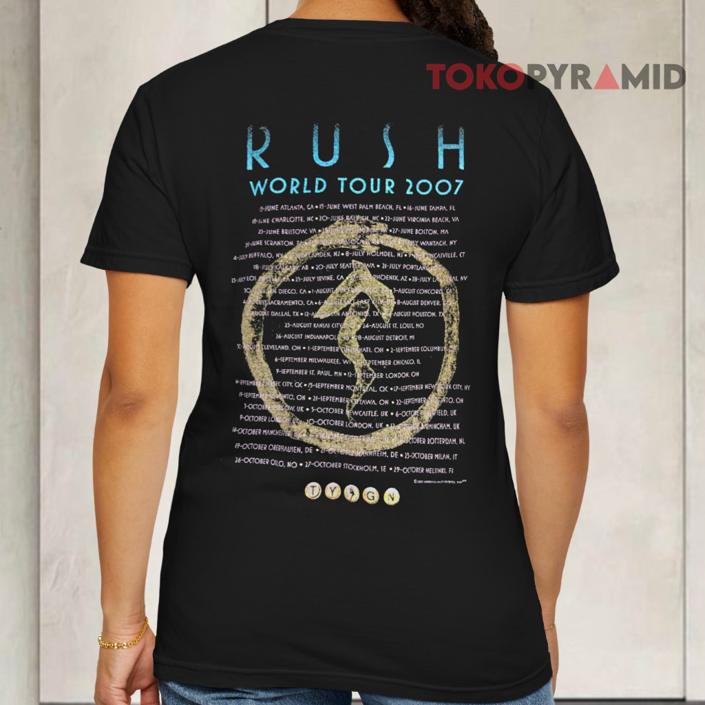 Turn to the back and the design continues with even more tour-inspired detail. At the top, “World Tour 2007” is printed in bold, followed by Rush’s recognizable symbol, anchoring the shirt in the band’s visual legacy. Additional graphics or text related to the tour enhance the look, making the back just as compelling as the front. The layout is balanced and powerful, a true nod to Rush’s attention to both music and visual identity.