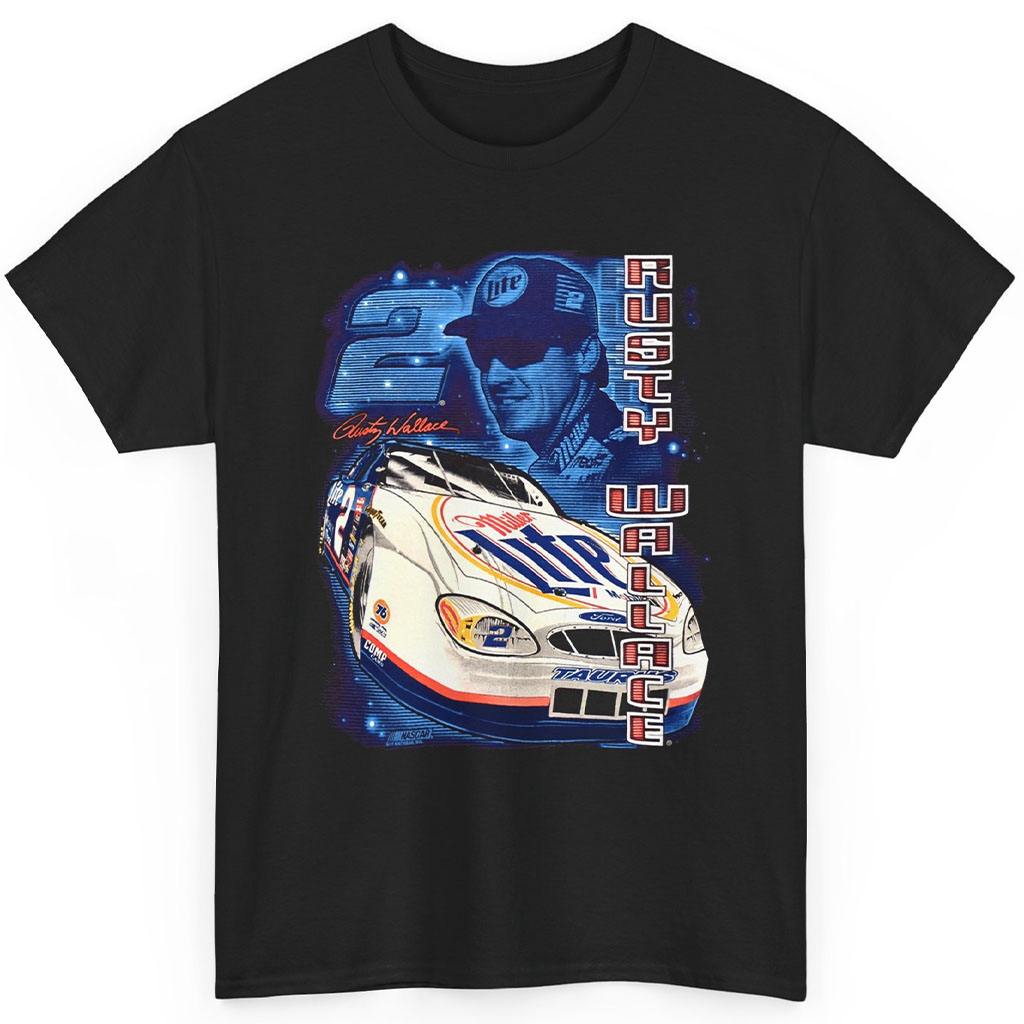 Introducing the Rusty Wallace Miller Lite T-shirt, a tribute to the legendary NASCAR driver Rusty Wallace and the iconic Miller Lite brand.