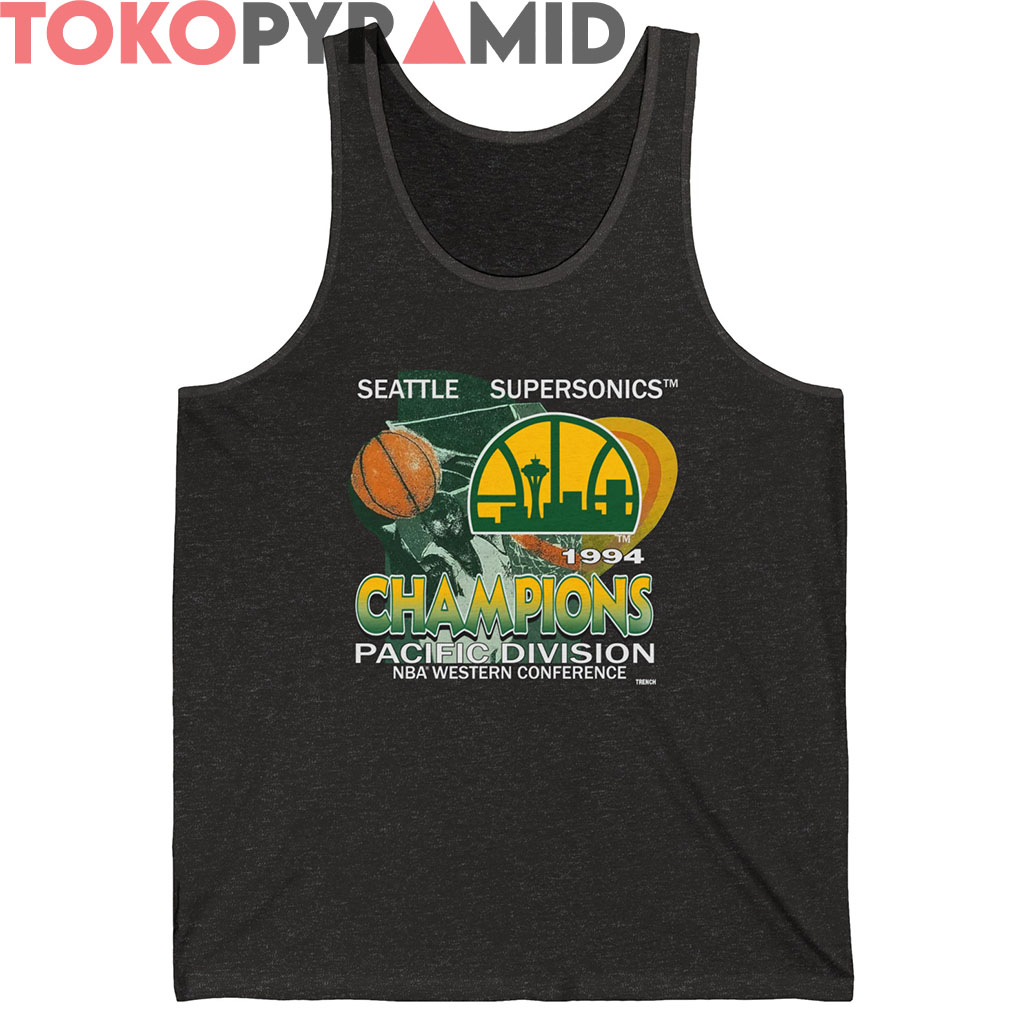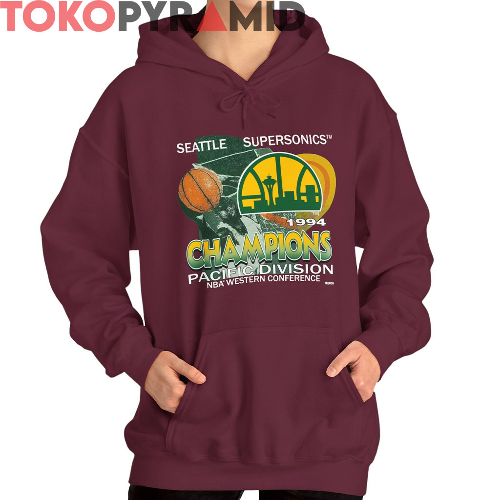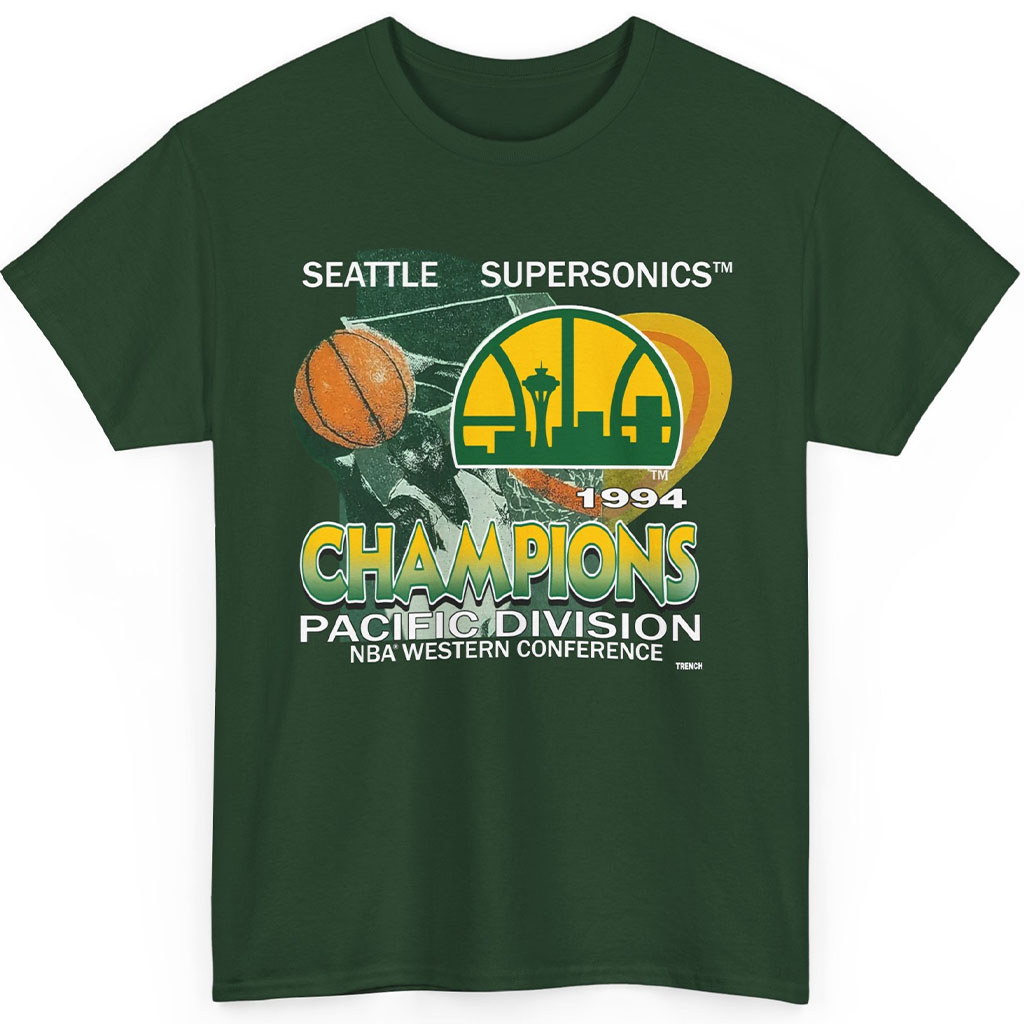 Step back into the golden era of mid-‘90s NBA dominance with the Seattle Supersonics 1994 Champions Shirt—a vibrant throwback to the year the Sonics soared to the top of the Pacific Division. This bold design explodes with retro flair, featuring the iconic skyline-laced Sonics logo front and center, framed by dynamic basketball motion graphics and sunburst tones straight from a vintage playbook.