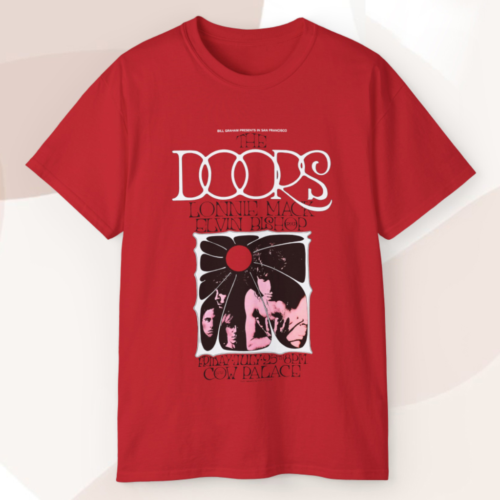 What makes this shirt stand out is its powerful design. At the center, the bold lettering of “The Doors Lonnie Mack Elvin Bishop” sits above the words “Cow Palace,” giving fans an instant reminder of the historic concert. The artwork highlights the essence of the rock scene from the 60s and 70s, bringing back the spirit of the golden age of music. It’s more than just a shirt—it’s a piece of history that reflects the rebellious energy and artistry of rock’s most influential figures.