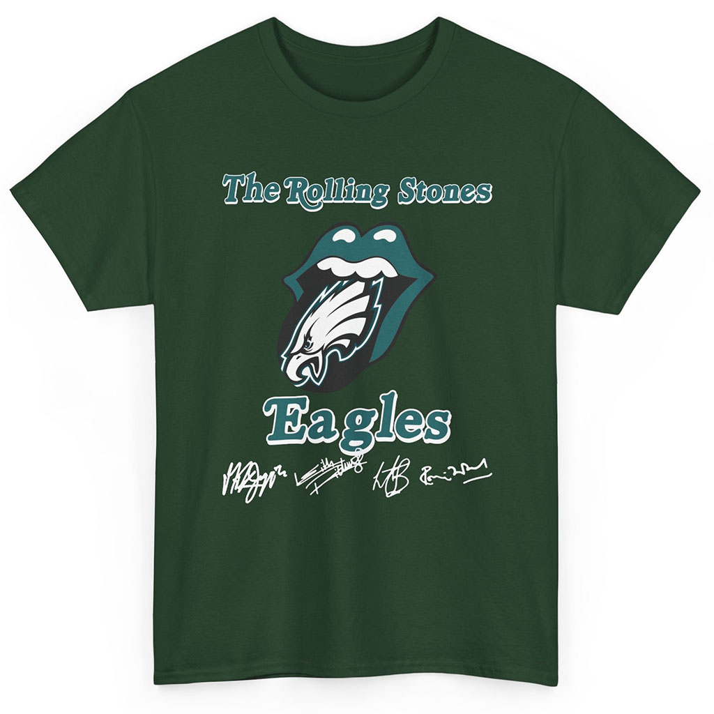 Beneath these iconic logos, the letters “Eagles” are prominently displayed, celebrating the powerhouse rock group that has etched their place in music history. And that’s not all – the Rolling Stones Eagles shirt is adorned with the signatures of some of the key players from the Eagles, paying homage to the individual talents that collectively created timeless melodies.