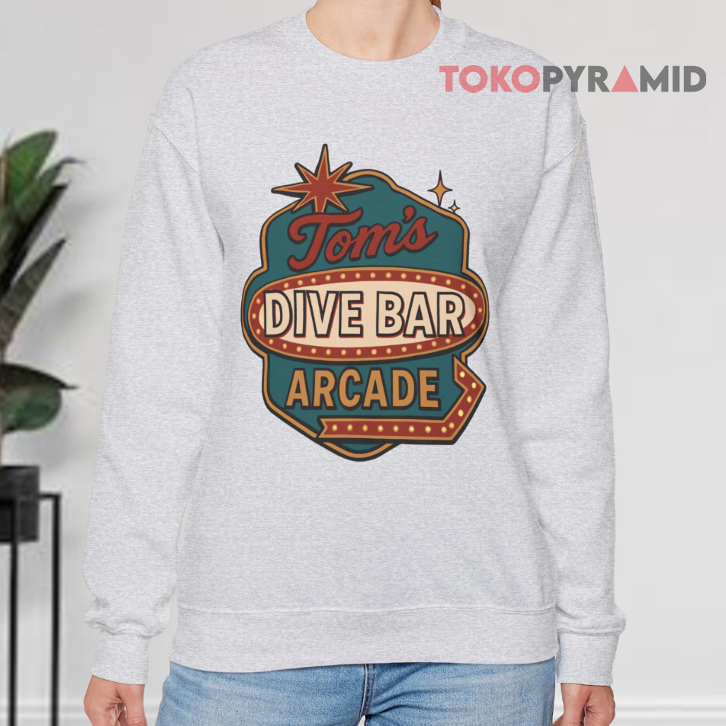 The front graphic features a vibrant and stylized sign reading “Tom’s Dive Bar Arcade,” designed to capture the energy of neon lights, pinball machines, and late-night hangouts. The artwork delivers a fun, gritty, and authentic feel that reflects classic dive bar charm mixed with arcade nostalgia. This distinctive design gives the Tom’s Dive Bar Arcade Shirt strong visual impact and makes it memorable at first glance.