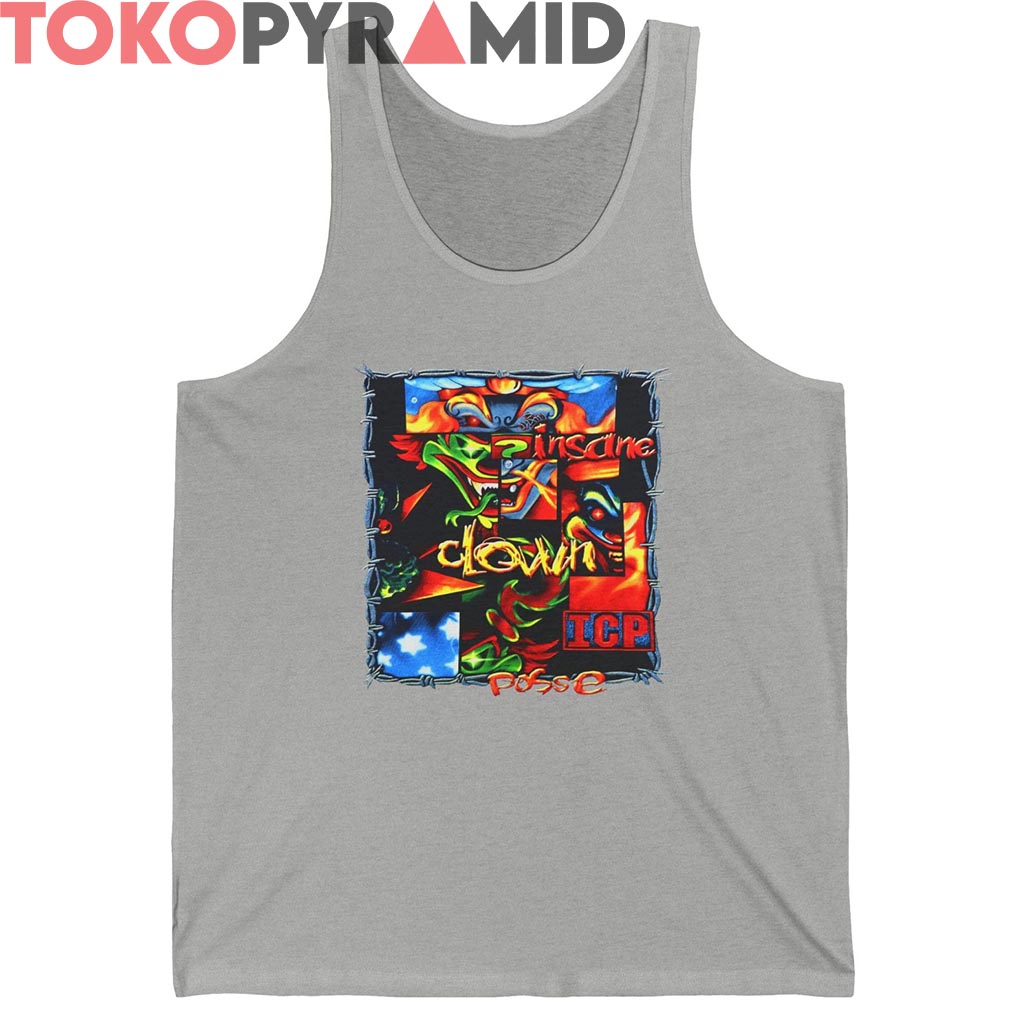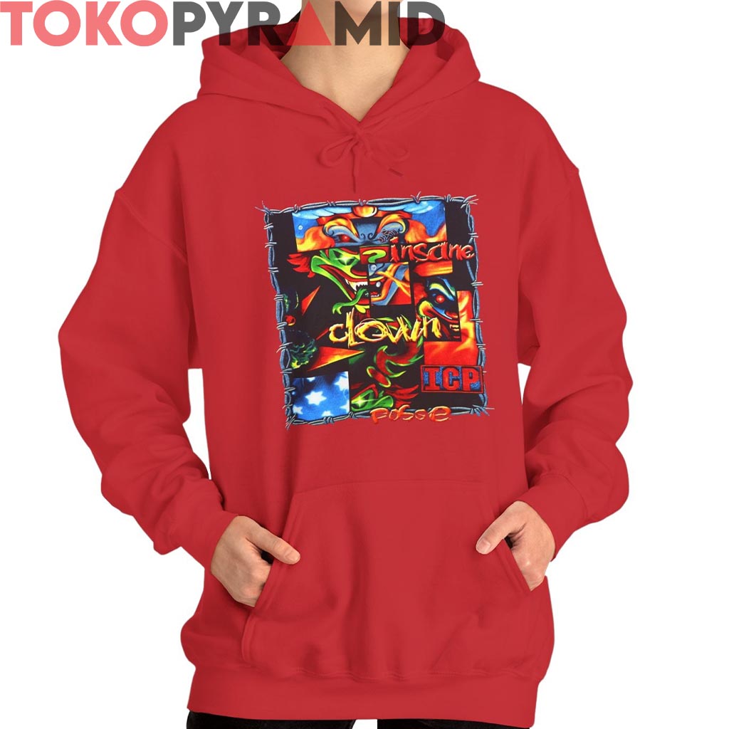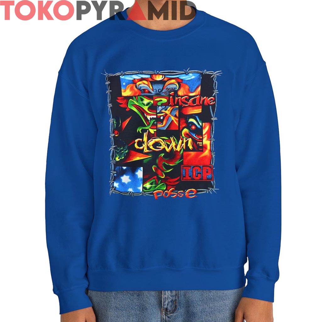 The Vintage 2000 Insane Clown Posse ICP Shirt is a pure visual riot—every inch a punch of psychotic color and chaotic energy straight outta the golden era of horrorcore. At first glance, you’re met with a grid of warped, menacing clown faces, splintered like stained glass from a funhouse mirror gone rogue. Fiery reds, acid greens, and electric blues burst from the shirt like flames from a gasoline-soaked carnival. Wrapped in barbed wire and layered with jagged edges, it’s not just a design—it’s a visual overload with ICP’s twisted spirit in every pixel.