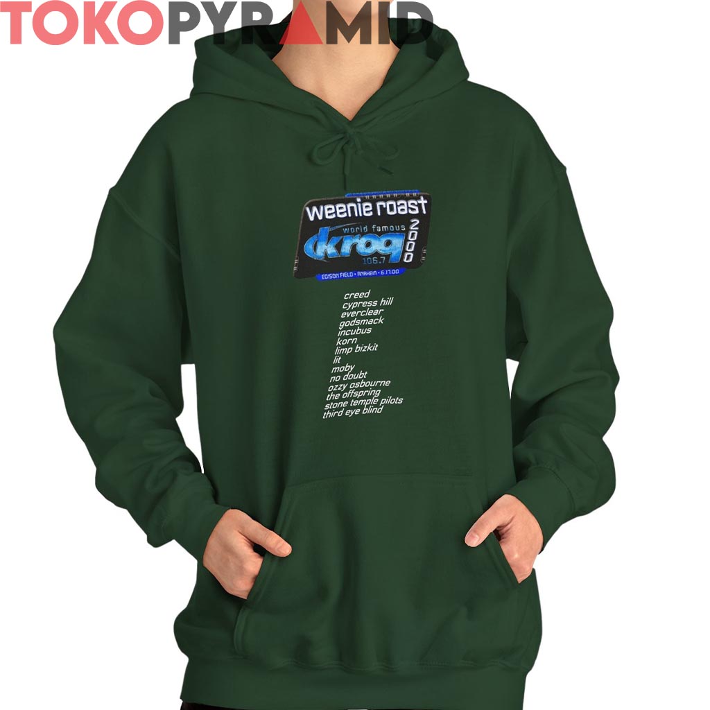 The front of the shirt features the official Weenie Roast 2000 badge-style logo in a bold, metallic blue design, with “world famous KROQ 106.7” stamped across the chest like a backstage pass to music history. But the real kicker? The stacked lineup printed below that reads like a Rock Hall nominee ballot: Creed, Cypress Hill, Everclear, Godsmack, Incubus, Korn, Limp Bizkit, Lit, Moby, No Doubt, Ozzy Osbourne, The Offspring, Stone Temple Pilots, Third Eye Blind—every name hits harder than the last.