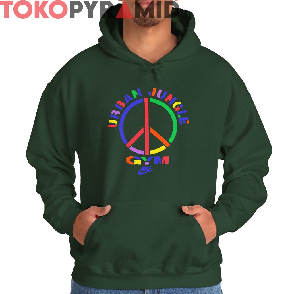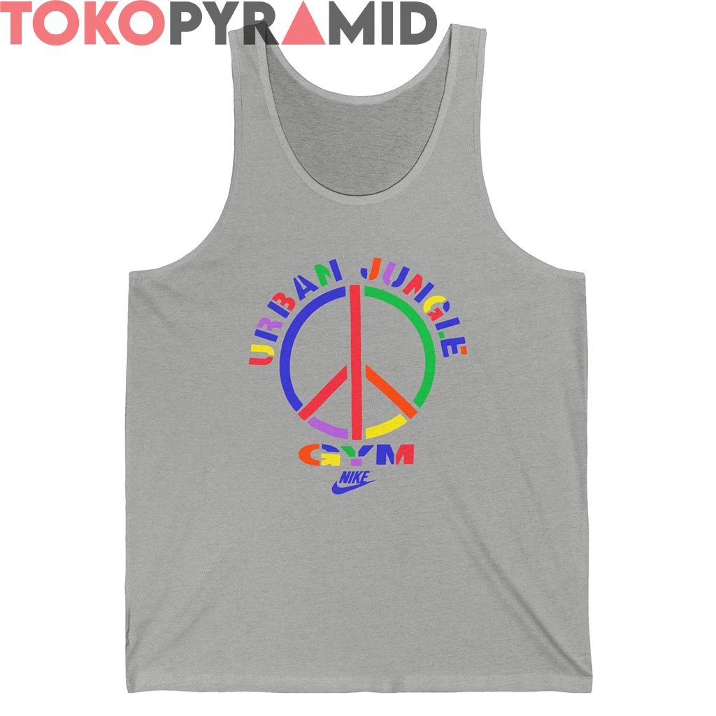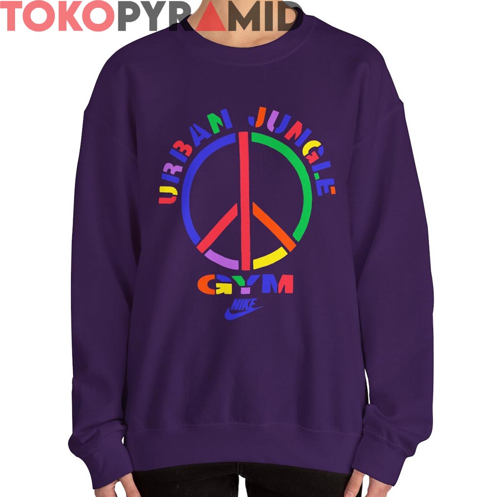 Surrounding the peace symbol, “URBAN JUNGLE GYM” arches in bold, color-block letters—each letter its own vibe, popping in vivid red, green, yellow, blue, and purple. At the base, the word “GYM” slams down in a mix of electric hues, backed up by that iconic retro Nike logo, sharp and smooth in deep purple.
