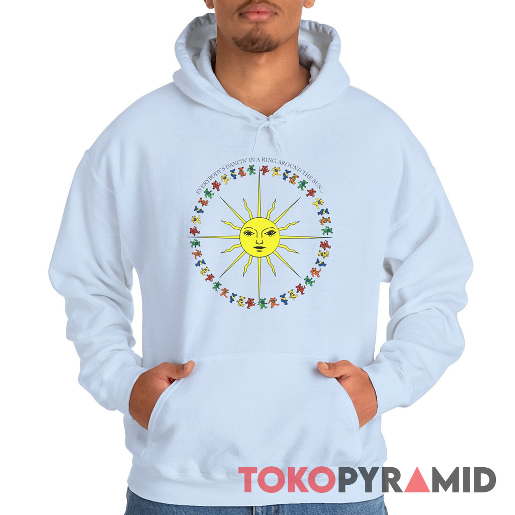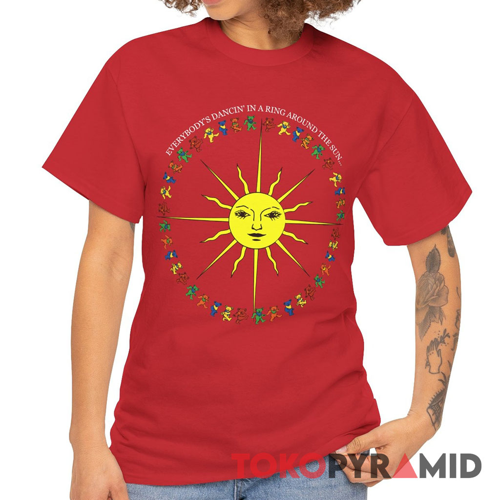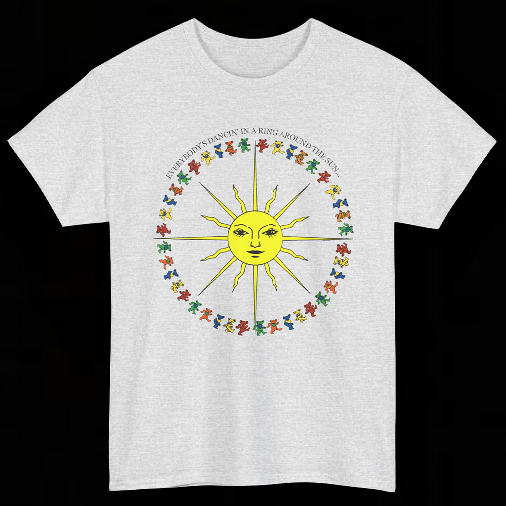 Above the bears and the sun, the shirt features the uplifting phrase “EVERYBODY’S DANCING IN A RING AROUND THE SUN”. This phrase encapsulates the sense of collective joy, movement, and shared experience that is often associated with the Grateful Dead’s music and community.