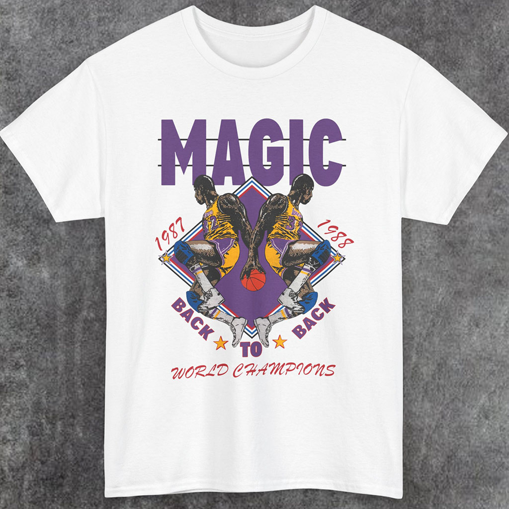Magic Johnson LA Lakers Back To Back World Champions Tee tee vividly captures the essence of those unforgettable years – the charisma, skill, and determination that Magic Johnson brought to the game.