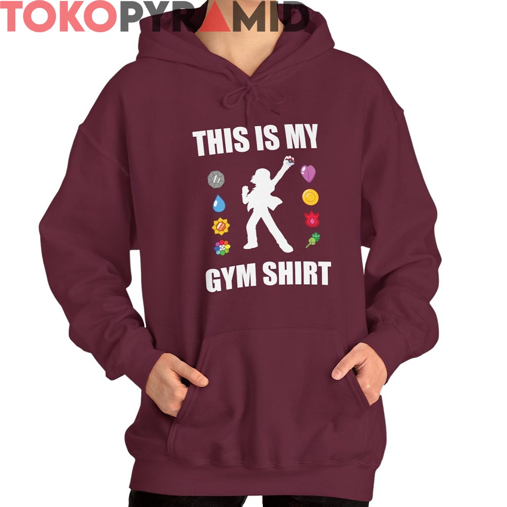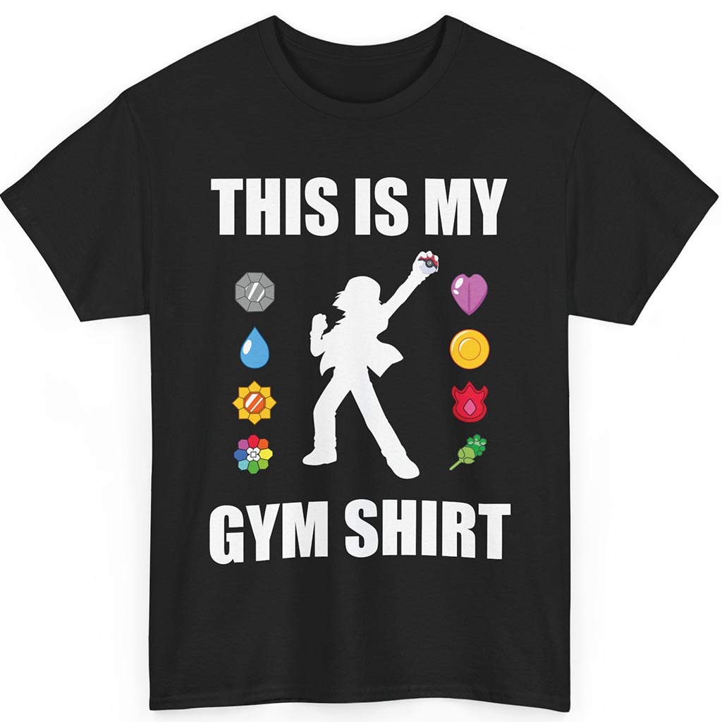 The text “THIS IS MY GYM SHIRT” explodes across the top and bottom in massive white block letters, echoing classic gym gear but with a Pokémon twist that makes it instantly iconic. The layout hits like a badge-check moment before the Elite Four—clean, confident, unmistakably from the golden age.