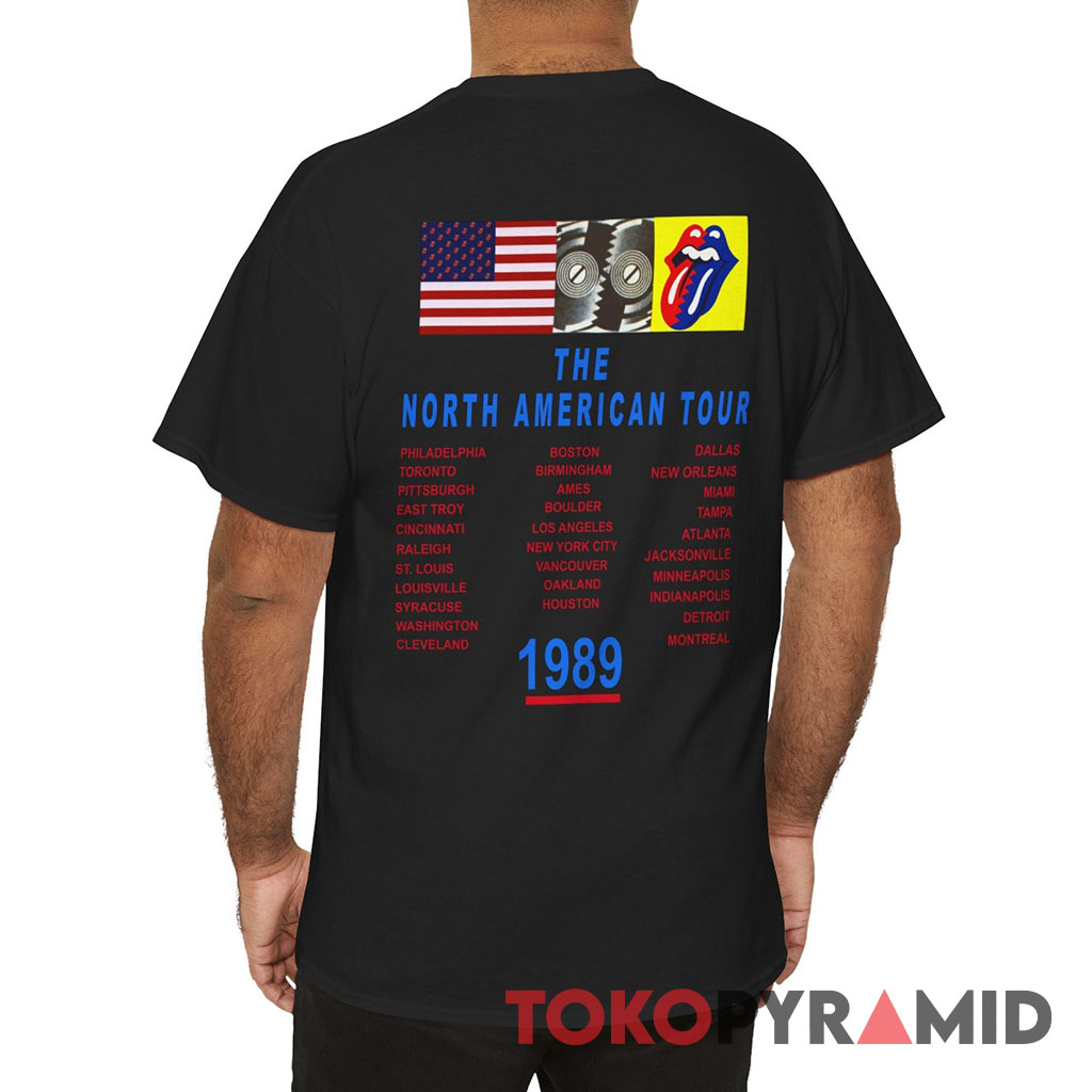 Turn the shirt around, and you’ll discover a historical map of the North American tour that accompanied the release of “Steel Wheels” in 1989. Each city and date marked on the back serves as a testament to the band’s electrifying performances that rocked arenas across the continent.
