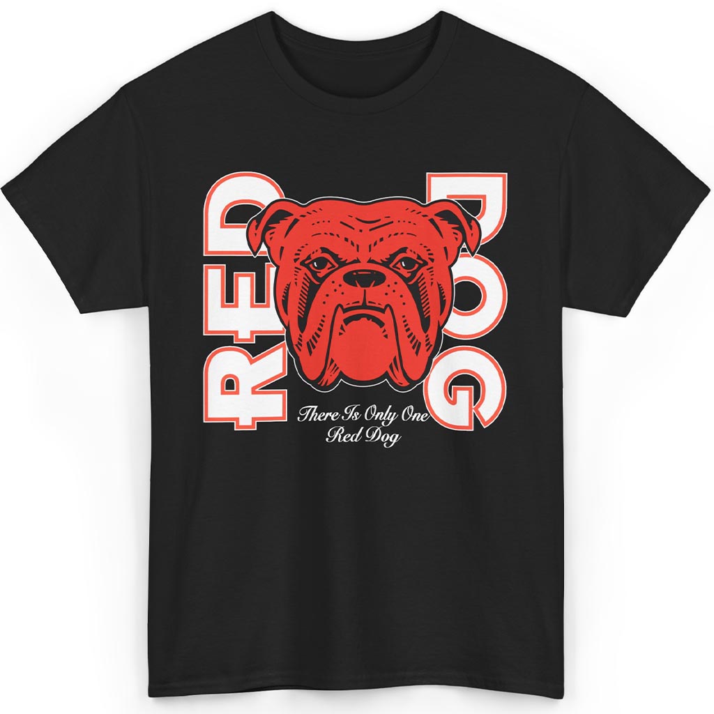 The white-and-red outlined text bursts off the black background with that unmistakable 90s athletic graphic vibe. It’s sharp, loud, and zero percent subtle. Tucked just under the bulldog’s intense glare is the classic tagline, “There Is Only One Red Dog,” scripted like a signature on a cult classic. You’re not just wearing a shirt—you’re wearing a warning.