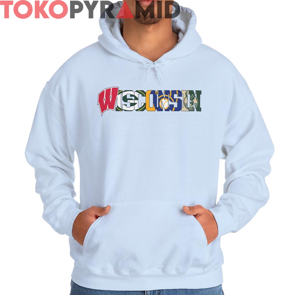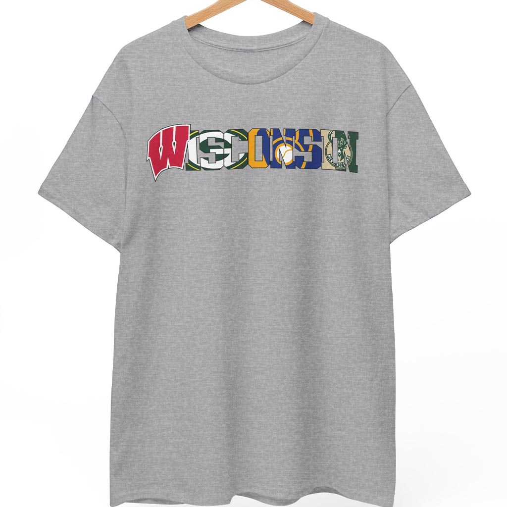 Set against a clean, heather gray backdrop, the vibrant team colors and tight composition pop with retro flair. Whether you’re cheering at Camp Randall, tailgating at Lambeau, or catching a Brewers game at American Family Field, this shirt has every corner of Wisconsin sports culture covered.